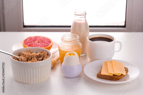 Healthy Foods For Breakfast Milkhoney Cereal Coffee Soft Boiled